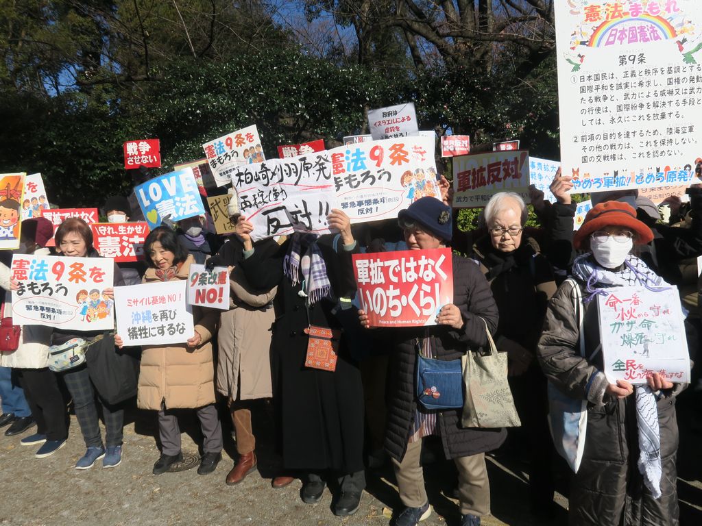 「軍拡反対!」「LOVE♥憲法」――。東京の国会正門前で1月3日、今年初の「3の日」行動があり、作家の渡辺一枝さんや芸人の松元ヒロさんら約230人が参加した。社会、政治に対する訴えや思いを記したプラカードなどを掲げ、平和と命が守られる世の中を希求した=写真。