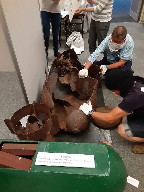 驚いたのは、毎年会場の入り口近くに置かれる焼夷弾の破片(2個)の重さだった。ふだんは「草の家」の玄関先にあり、展示のたびに軽トラックで運び込む。荷台に上げるのも下ろすのも男4人がかりで、ひとりではとても動かせない。