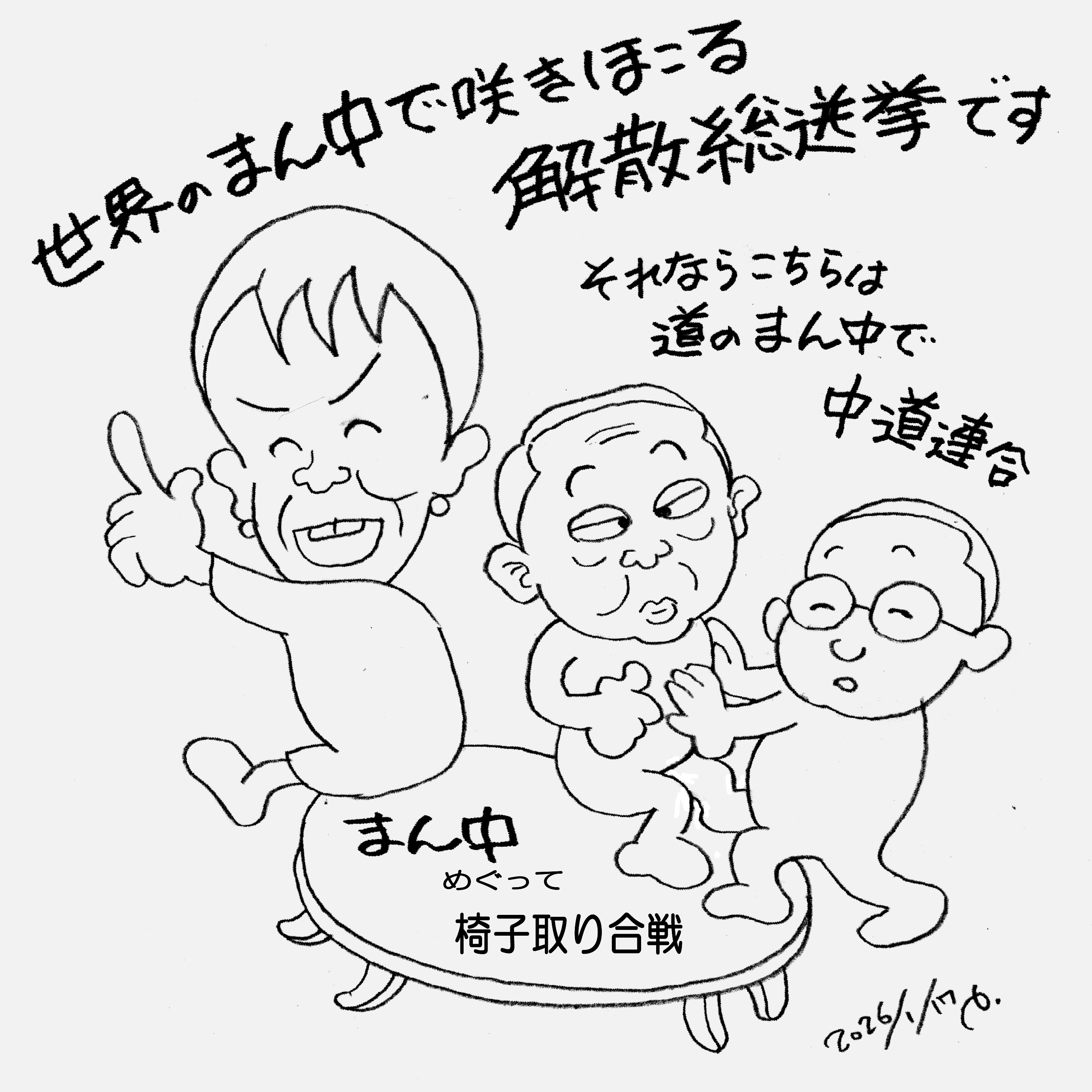 「自・維内閣」を発足させた高市首相は10月21日の施政方針演説で「ライフ・ワーク・バランスを捨てる」「世界の真ん中で咲き誇る日本外交を取り戻す」と宣言した。「非核3原則」を見直し、「防衛装備移転3原則」の「5類型」を廃止し、「スパイ防止法」を復活させ、アメリカが目論むGDP比3.5も視野に入れて防衛費をGDPの2%に増額する。国会での「台湾有事」答弁で中国との関係をこじらせている高市内閣は、明けて新年1月3日にトランプ米大統領が南米ベネズエラを攻撃し、マドゥロ大統領を拉致するという暴挙は容認。発足後3か月にも満たないこの内閣は、生活・物価対策、政治とカネなどの重大案件をすべて棚上げして、国会の冒頭解散を狙っている。これを咎めて「市民と野党の共闘」を今こそ! というのが当然の成り行きなのだが、野党共闘のリーダーたるべき立憲民主党が公明党とともに「中道改革連合」なる新党をつくるという。「世界の真ん中で咲き誇る」高市政権の「真ん中」を衝くというシャレかしら?