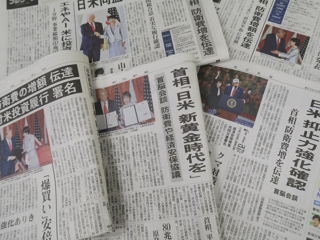 高市首相とトランプ大統領による日米首脳会談を報じる各紙自民党と維新の会の「連携」で10月に発足した新政権は、早くも軍事強化の新たな「種」をまいている。高市早苗首相は、来日した米国のトランプ大統領との会談(28日)で、「防衛費のGDP2%引き上げ」を前倒しで行うと伝達した。